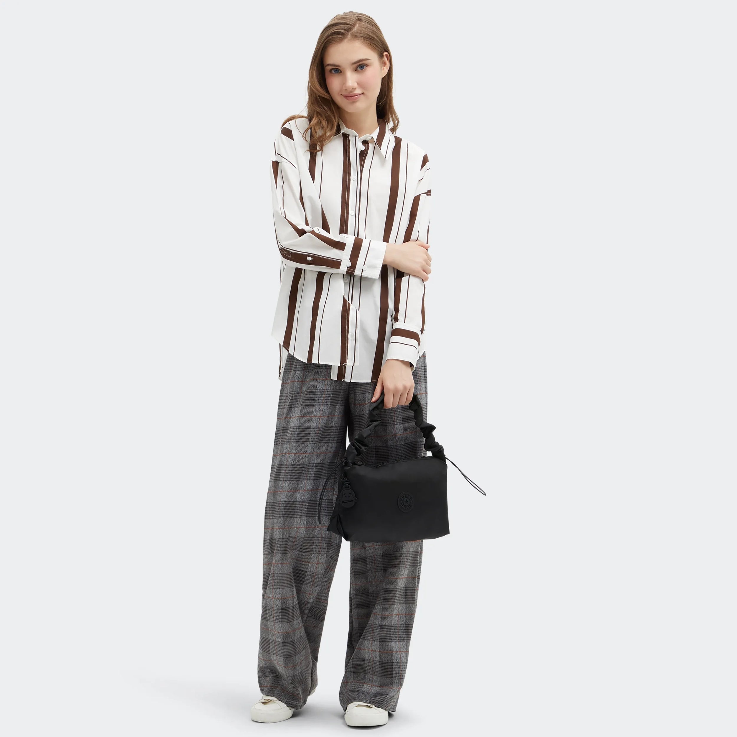 Made with smooth recycled nylon fabric. Eleni is the shoulder bag of the season. The modern silhouette and scrunched shoulder strap make it a cool bag option to add to the rotation. Eleni is perfect for a night out or going to a concert or sports event.